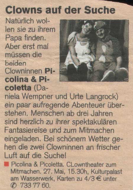 Natürlich wollen sie zu ihrem Papa finden. Aber erst mal müssen die beide Clowninnen Picolina & Picoletta (Daniela Wempner und Urte Langrock) ein paar aufregende Abenteuer überstehen. Eine spektakuläre Fantasiereise zum Mitmachen.